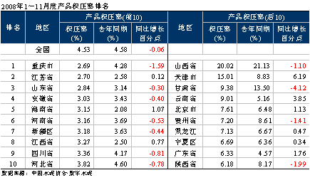 水泥產(chǎn)品積壓率最低前10的地區(qū)均在4%以下,較上個季度又有所降低:排名第一的重慶,由于本地市場需求旺盛以及受四川災(zāi)后重建啟動影響;而山東、安徽等很多地區(qū)的企業(yè)及時調(diào)整生產(chǎn)節(jié)奏,控制庫存,面對市場下行的趨勢有效地解決產(chǎn)品積壓的問題。水泥產(chǎn)品積壓率最高的前10地區(qū)中,山西省以積壓率20.02%為最,比2007年同期微降1.10個百分點(diǎn)。