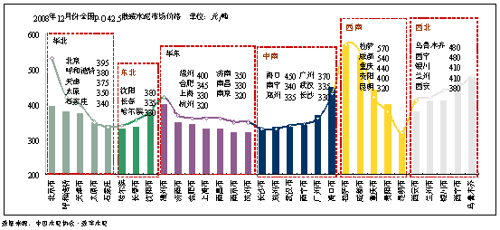 截止2008年12月,根據(jù)數(shù)字水泥網(wǎng)對全國31個城市水泥價格的跟蹤情況顯示,全國水泥市場平均價格P.O42.5散裝383元/噸,與2007年同期325元/噸相比,增長17.64%。增長幅度最大的是西寧、銀川、重慶、蘭州和濟(jì)南,均在40%以上。