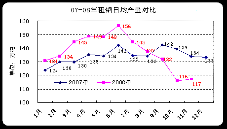 今年年初,鋼鐵生產所需原燃料價格不斷上升,鋼材各品種內需旺盛、出口勢頭不錯,粗鋼、鋼材產量得以持續(xù)穩(wěn)步增加,粗鋼日均產量在6月達到156萬噸,相當于5.7億噸年產量。之后,為了兌現綠色奧運這一莊嚴承諾,華北六省市部分鋼鐵企業(yè)在奧運召開前夕選擇為奧運讓路,主動停限產,再加上需求受到傳統(tǒng)淡季及高價位的雙重制約,三季度粗鋼產量呈現下降趨勢。原本以為鋼廠產量會隨著“金九銀十”這一傳統(tǒng)旺季到來而再度走高,但市場行情下挫態(tài)勢毫無止跌之意,發(fā)端于美國的次貸危機很快轉化為全球性金融危機,價格加速回落,而鋼廠原料庫存成本居高不下,不得不相繼宣布停產或限產,10月粗鋼日均產量隨即降至06年下半年以來最低水平。