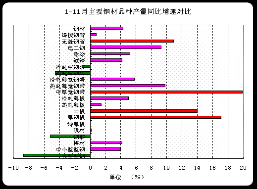 在鋼材總產量增速回落的大背景下,鑒于鋼鐵生產企業(yè)力爭進一步優(yōu)化產品結構,新建項目基本為板材項目和管材,各鋼材品種產量由此出現分化,前11個月長材累計產量低于去年同期,出現負增長,板帶材增速則較鋼材總產量增速高出近7個百分點。具體到各品種,中厚寬鋼帶增速最快,接近20%,厚鋼板和中厚板產量增速也不錯,約為14-17%,接下來便是無縫管和熱軋薄寬鋼帶,相比之下,大中型材、螺紋以及熱軋窄帶產量則呈負增長,同比下降5-9個百分點。