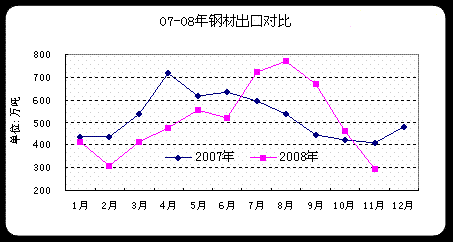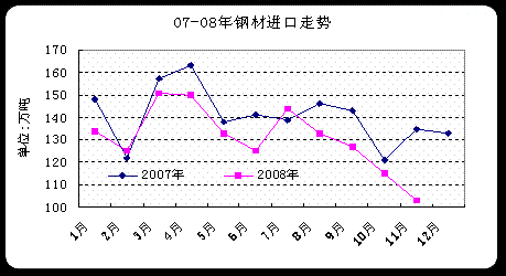 與國內外市場價格走勢相一致的是,今年我國鋼材出口呈先增后降態(tài)勢,4季度降幅最為明顯。今年上半年,國際經濟形勢尚好,需求較為旺盛,再加上國內外價差較大,買賣雙方商家積極性都很高,鋼材出口量持續(xù)上升,單月出口量在8月達到768萬噸的歷史最高水平。在此之后,金融海嘯悄然來襲,實體經濟相繼受到沖擊,需求急轉直下,鋼材出口量快速下降,11月份降至300萬噸以來,為2006年下半年來最低水平。預計全年出口量不足6000萬噸。