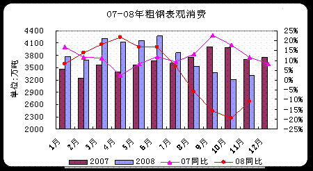 奧運會的成功召開的背后是各行業(yè)默默支持,其中便包括鋼鐵行業(yè),為支持奧運,華北六省市部分鋼企在7、8月主動停限產。就在奧運結束不久,宏觀經濟面急轉直下,從根本上抑制了國內產能釋放和市場消化能力。受此影響,今年以來粗鋼表觀消費量增速大幅回落,前11個月表觀消費同比增速較去年同期回落近7個百分點,其中8-11月連續(xù)4個月呈負增長態(tài)勢。