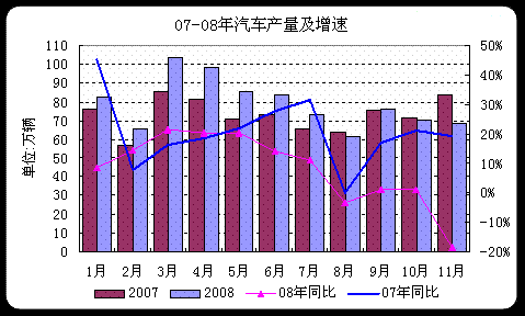 今年汽車行業(yè)日子并不好過,上半年受原燃料價格不斷上漲的困擾,下半年后期又深受金融危機的沖擊,產銷狀況不理想,全年產銷實現1000萬輛的夢想宣告破滅。1-11月我國汽車累計產銷870.40萬輛和862.98萬輛,同比增長7.98%和8.52%,分別比07年同期回落14.27個百分點和14.67個百分點,汽車銷量同比增幅自2005年7月以來首次低于10%。很顯然,與前幾年中國汽車市場高速增長相比,增速有所放緩,在外部環(huán)境持續(xù)惡化和國內消費萎縮等因素影響,中國汽車產銷增速放緩十分明顯,中國汽車市場在經歷了多年的持續(xù)增長后進入新一輪調整期。