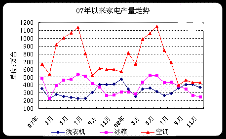 由于內需外需同步萎縮,家電產量增速持續(xù)回落,其中空調產量連續(xù)6個月呈現負增長,出口量值同時明顯下滑。最新統(tǒng)計數據顯示,11月家用洗衣機、冰箱和空調產量同比均出現負增長,降幅分別為10.7%、4.9%和23%,1-11月洗衣機累計產量同比增加約11個百分點,冰箱產量同比增加3%,同期空調產量則下降2.8%。