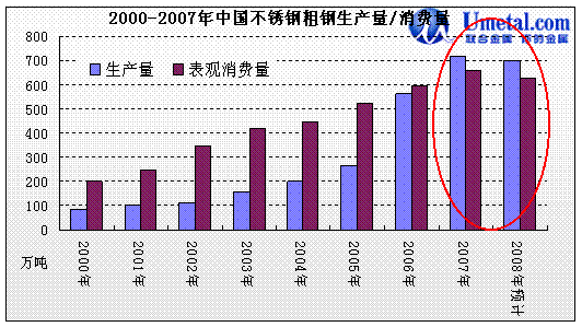 圖1、2000-2007年中國不銹鋼粗鋼產(chǎn)量和消費(fèi)量情況
