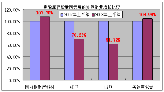 (圖1、2)2008年上半年,已經(jīng)出現(xiàn)許多影響國內(nèi)不銹鋼需求的因素,但由于國內(nèi)經(jīng)濟(jì)總體上快速增長,上半年,國內(nèi)不銹鋼表觀消費(fèi)同比增長率8.50%,與上年增長幅度10%-15%之間相比,增長速度有所放緩,但仍然表現(xiàn)出較高的水平,但是增長速度放緩,考慮市場和鋼廠庫存增長因素,實際需求增速仍保持5%左右增長速度。上半年實際需求增長幅度下降趨勢比表觀消費(fèi)增長放緩嚴(yán)重;不銹鋼增長速度明顯放緩的根本原因是宏觀經(jīng)濟(jì)增長放緩;對國內(nèi)不銹鋼產(chǎn)業(yè)造成超過國內(nèi)消費(fèi)放緩水平壓力的主要原因是世界經(jīng)濟(jì)不好;國家進(jìn)出口貿(mào)易政策變化加劇了國內(nèi)不銹鋼產(chǎn)業(yè)面臨的困難。特別是國家關(guān)于不銹鋼深加工制品出口貿(mào)易政策的變化,造成了不銹鋼冷軋寬板進(jìn)口數(shù)量的逆市上升。