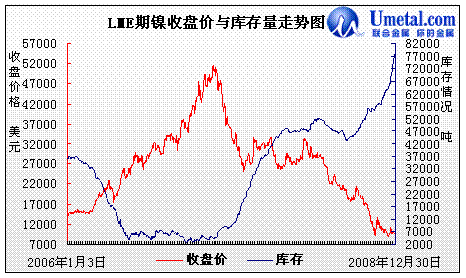 圖3:2006年-2008年LME三月期鎳收盤價與庫存量走勢圖