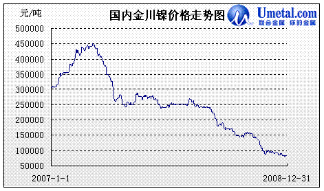 。2)國內(nèi)鎳市:圖4:2008年國內(nèi)金川鎳價格走勢基本與國際鎳價接軌,價格由年初的242000元跌至84000元,跌幅達(dá)65%。