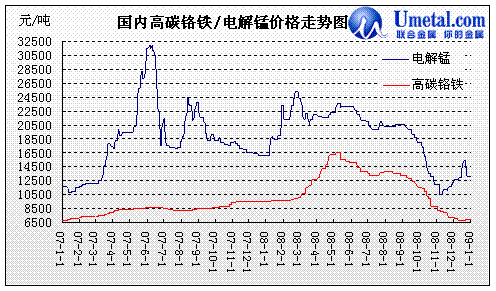 高碳鉻鐵方面:2008年國內(nèi)鉻鐵市場跌宕起伏,有很多客觀因素、圍觀因素,比如奧運(yùn)會、環(huán)保、限電等,但最基本的因素仍是由供需方面所構(gòu)成。08年前五個月高鉻市場受鉻礦價格、運(yùn)費(fèi)、關(guān)稅等方面的影響繼續(xù)延續(xù)07年的漲勢;但是自6月份開始,在鐵礦價格下跌的帶動下,鉻礦價格也開始下滑,隨后不銹鋼廠需求的下降直接導(dǎo)致高鉻價格大幅下跌,70-80%的高鉻生產(chǎn)企業(yè)被迫停產(chǎn)或轉(zhuǎn)產(chǎn)。08年最后一月特別是春節(jié)前的一個月,往往都是商家采購的相對頻繁的時期,出于對春節(jié)后市場不確定的考慮,備有適量生產(chǎn)庫存的現(xiàn)象顯得較為常見。截至08年底高鉻市場價格穩(wěn)定在6500-7000元/噸。