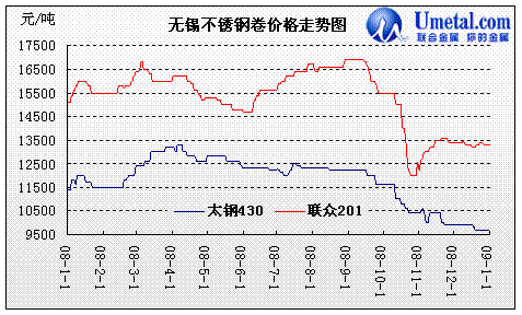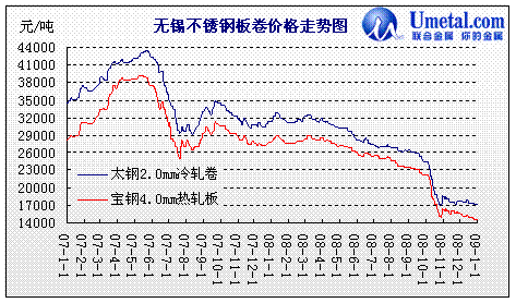 08年下半年隨著美國次貸危機(jī)轉(zhuǎn)化為國際金融危機(jī),金融行業(yè)三季級度損失慘重,對于基金炒做的期貨市場更是經(jīng)歷一場嚴(yán)寒,作為不銹鋼重要原料之一的鎳, 07年5月份價格漲至歷史最高水平,達(dá)到51600美元/噸;隨后受下半年美國次貸危機(jī)影響價格一路跌至26000美元,跌幅高達(dá)49.6%。鎳價在08上半年雖有回頭之勢,但隨著全球金融危機(jī)的爆發(fā),鎳價由08年初的26000美元一度跌破10000美元大關(guān),10月份對于期貨市場來說無疑更是一場惡夢,單月跌幅達(dá)6700美元/噸,隨后便一蹶不振。對于不銹鋼市場走勢來說,在需求不斷縮減,原料成本大幅下跌,市場價格不斷走低的情況下,不銹鋼廠被迫開始施行“減產(chǎn)保價”政策,據(jù)聯(lián)合金屬網(wǎng)統(tǒng)計最后一個季度鋼廠產(chǎn)量只維持原有水平的40-50%。