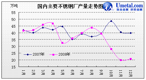 08年國內(nèi)不銹鋼市場行情在低迷與下跌中渡過,在經(jīng)歷了市場行情考驗,尤其是原料價格下跌以及市場行情逆行的拖累,下半年鋼廠方面存貨虧損嚴(yán)重,部分鋼廠甚至不得不通過停產(chǎn)來應(yīng)對行情的低迷,更有鋼廠將近一半的產(chǎn)能轉(zhuǎn)化到碳鋼的生產(chǎn)上;同時為穩(wěn)定市場行情,鋼廠方面甚至聯(lián)合出臺除減產(chǎn)政策外的市場指導(dǎo)價格政策,希望干預(yù)市場價格穩(wěn)定投資者心態(tài)。