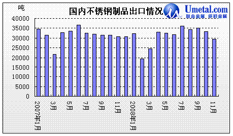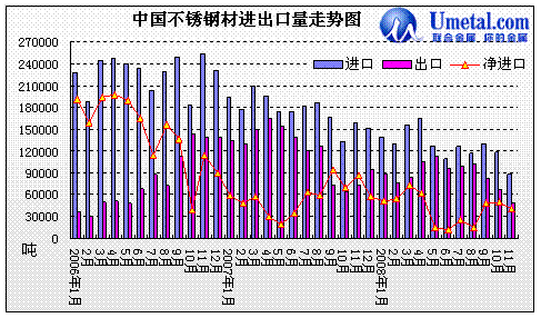 圖10:從據(jù)海關(guān)資料統(tǒng)計顯示,2008年1-11月份我國不銹鋼進(jìn)口總量為1406644噸,同比下降28.05%;2008年1-11月份不銹鋼出口量為958450噸,同比下降28.02%。2008年11月我國不銹鋼出口量為47941噸,較上月環(huán)比減少28.75%;不銹鋼進(jìn)口量為88302噸,較上月環(huán)比下降25.07%。