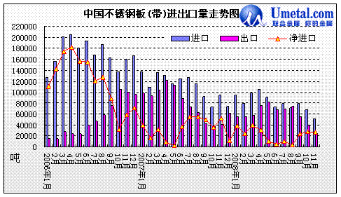 進(jìn)口方面,07年1-11月份進(jìn)口不銹鋼板材為1254330噸,而08年1-11月份進(jìn)口量下降至886257.28噸,同比下降29.34%。2008年11月我國不銹鋼板材進(jìn)口量為50481.77噸,環(huán)比下降25.56%,凈進(jìn)口量為26213.56噸,環(huán)比上月減少1881.54噸。