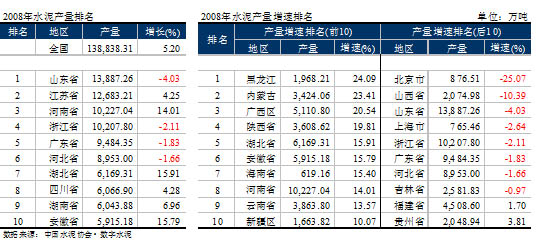 地區(qū)分布上,黑龍江、內(nèi)蒙古、廣西在區(qū)域內(nèi)經(jīng)濟(jì)拉動下,增速超過20%以上,河南水泥產(chǎn)量首次突破1億噸,沖進(jìn)全國三甲;8個省出現(xiàn)負(fù)增長,產(chǎn)量大省山東、浙江、廣東和河北均在其中,也是2008年全國水泥產(chǎn)量較2007年增速下降的主要原因。