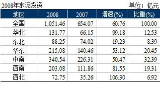 由于2006和2007年水泥市場偏暖,激發(fā)了投資者的熱情,2008年水泥投資快速上揚。水泥投資完成1,051.46億元,同比增長60.76%,高出去年同期近400億元。