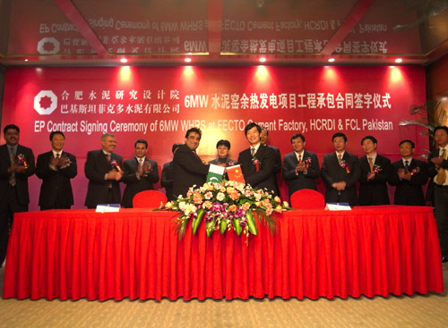 2009年2月19日,合肥水泥研究設(shè)計(jì)院與巴基斯坦菲克多水泥有限公司6MW水泥窯純低溫余熱發(fā)電工程承包合同簽約儀式在合肥希爾頓酒店隆重舉行。徐寧院長(zhǎng)、巴基斯坦菲克多水泥有限公司主席Mr.Fecto代表雙方在合同上簽字。安徽省商務(wù)廳副廳長(zhǎng)朱寧、合肥市對(duì)外經(jīng)貿(mào)局副局長(zhǎng)劉照軍、中國(guó)建材集團(tuán)國(guó)際合作部經(jīng)理衛(wèi)鋒、菲克多水泥有限公司總經(jīng)理及項(xiàng)目經(jīng)理和我院相關(guān)部門(mén)領(lǐng)導(dǎo)出席了簽字儀式。