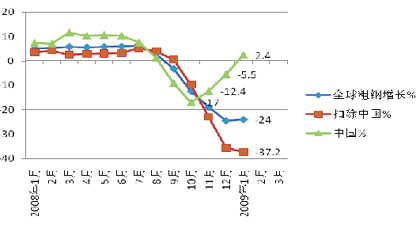 (2)從各月的粗鋼產(chǎn)量同比增長情況看,全球盡管跌速放緩,但仍呈回落態(tài)勢,而中國則連續(xù)三個(gè)月增速回升,前兩個(gè)月粗鋼增長了2.4%。全球1月份則減少了24.0%,扣除中國外的粗鋼產(chǎn)量減少了37.2%。2月份中國粗鋼日產(chǎn)量水平上升至144萬噸,月產(chǎn)量同比增長4.9%;按照中鋼協(xié)的3月上旬預(yù)測,3月份日產(chǎn)水平在138萬噸左右,仍高于2008年平均日產(chǎn)水平。如果國內(nèi)不能有效地限制產(chǎn)能的發(fā)揮,并且出口不能制止萎縮的話,3月份很有可能是凈進(jìn)口的局面,意味著占將近全球一半粗鋼產(chǎn)量的中國國內(nèi)市場供大于求的局面將進(jìn)一步加劇,鋼價(jià)回升也將變得更為遙遠(yuǎn)。