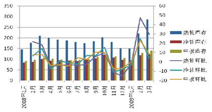 (2)承接去年11月中旬的上升走勢,進入2009年以來,2月份以前鋼材曾持續(xù)上升,鋼廠和流通商信心大振,鋼廠忙于擴大和恢復產能,而流通商則忙于填充幾近荒廢的料場,一時間購銷兩旺,雖然天氣依然寒冷,但市場儼然已經提前享受春天的溫暖了。作為國內的風向標,寶鋼、武鋼等鋼鐵巨頭相繼上調其2月、3月出廠價格,其中熱卷價格上調了400元/噸、冷板上調了600元/噸、鍍鋅板上調650元/噸。國內其他鋼廠也相繼上調出廠價格。但是在2月上旬,鋼價再次進入下降通道,并且在3月初跌回上輪價格漲前水平。鋼材價格的迅速回落,使市場上快速積累起來的鋼材庫存進入尷尬的兩難境地,一方面庫存高企卻面臨需求萎縮、價格下跌的困境,另一方面若本輪再采取低價拋售回籠資金的話,除代價很大外,庫存主體已經由鋼廠轉為流通商了。