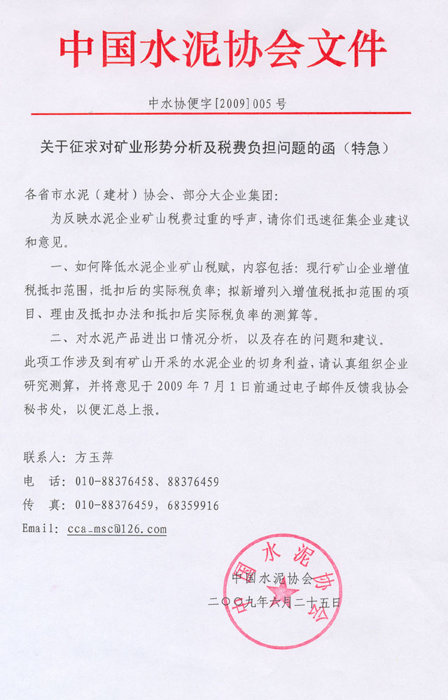 關(guān)于征求對礦山形勢分析及稅費負(fù)擔(dān)問題的函(特急)