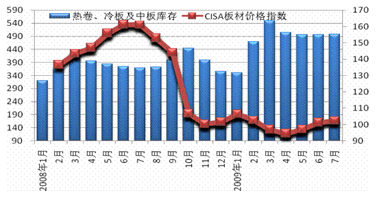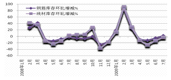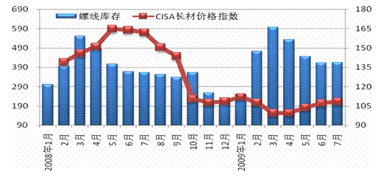 自今年3月份起,長材價格逐步企穩(wěn)回升,與之相對應(yīng)的則是庫存水平的大幅回落,7月庫存比3月庫存累計(jì)降低了30%。然而庫存持續(xù)消減的趨勢在7月份出現(xiàn)停滯,庫存呈觸底回升的趨勢,價格漲幅也趨于和緩。一方面是由于庫存消化達(dá)到底部,面對需求和價格的上升,流通商重新開始建立庫存,另一方面,也表明預(yù)計(jì)鋼市走向趨升的市場信心較為充足。