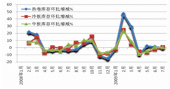 從熱卷、冷板和中板庫存環(huán)比變化情況看,出現(xiàn)了同長材相似的變化趨勢。