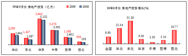 09年1~6月份房地產(chǎn)投資14,505億元,同比增長9%,表現(xiàn)超預期。華東地區(qū)房地產(chǎn)投資額5,440億元,占全國38%;中南投資額3,070億元,占全國21%。華東、中南和西南同比增長均低于全國水平,中南地區(qū)受廣東市場低迷影響,增幅最低。