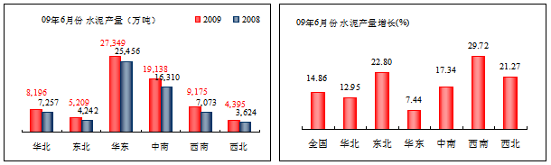 受投資拉動,09年1~6月份水泥產(chǎn)量73,462萬噸,同比增長15%,其中六月份當月水泥產(chǎn)量15,759萬噸,再創(chuàng)月產(chǎn)量新高,預計今年底全國產(chǎn)量將接近16億噸。華東地區(qū)產(chǎn)量27,349萬噸,占全國37%,中南地區(qū)產(chǎn)量19,138萬噸,占全國26%;華東地區(qū)產(chǎn)量增速低于全國增速7個百分點,西南、東北、西北地區(qū)產(chǎn)量增速均都超過20%;