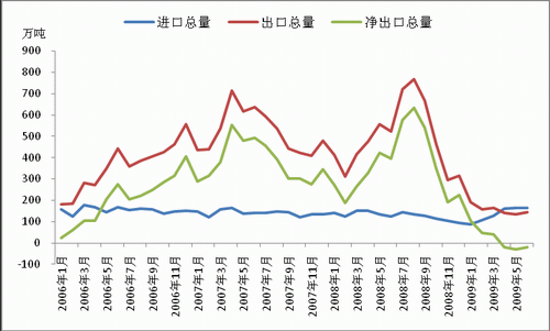受世界經(jīng)濟(jì)衰退、需求大幅萎縮的影響,進(jìn)入2009年國內(nèi)鋼材出口面臨嚴(yán)峻的困境與挑戰(zhàn)。在已經(jīng)過去的2009年上半年,國內(nèi)鋼材貿(mào)易進(jìn)出口總量大幅縮減、出口持續(xù)低迷成為市場最主要的特征,體現(xiàn)為國內(nèi)鋼材出口總量同比大幅減少,相對而言,由于需求、國內(nèi)外價差等因素的影響,進(jìn)口總量小幅上升。
