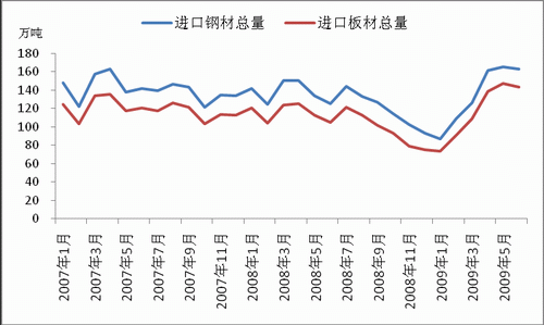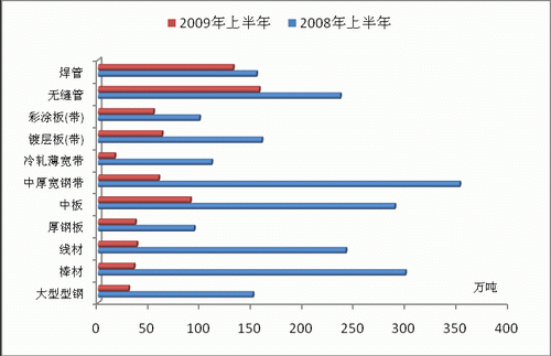 2009年上半年國內(nèi)進(jìn)口鋼材812.2萬噸,同比下降僅1.6%。在主要進(jìn)口品種中,板材累計(jì)進(jìn)口704.4萬噸,同比增長2%,成為國內(nèi)鋼材從凈出口轉(zhuǎn)向凈進(jìn)口狀態(tài)的主要變化因子之一;棒線材累計(jì)進(jìn)口32.3萬噸,同比下降37.3%;管材累計(jì)進(jìn)口36.7萬噸,同比下降27.6%。