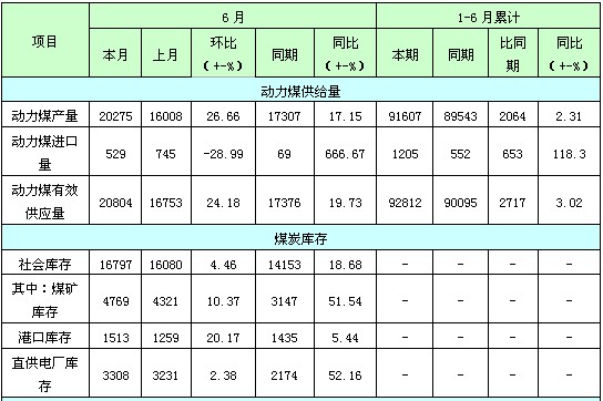 1、本月,中國動力煤產(chǎn)量環(huán)比上漲26.66%。內(nèi)蒙古煤炭產(chǎn)量仍維持全國第一。今年6月份,內(nèi)蒙古自治區(qū)煤炭產(chǎn)量達到5824萬噸。1-6月份,內(nèi)蒙古原煤產(chǎn)量完成28577萬噸,比去年同期增加6159萬噸,增長27.48%。在地方財政壓力不斷加大影響下,山西省地方煤礦復(fù)產(chǎn)進度加快,煤炭產(chǎn)量迅速增加。本月,山西省煤炭產(chǎn)量達到5792萬噸,環(huán)比上漲18.28%。其中,地方煤礦煤炭產(chǎn)量達到2485萬噸,環(huán)比增加42.24%。1-6月,山西省原煤產(chǎn)量為2.59億噸,同比下降14.63%。