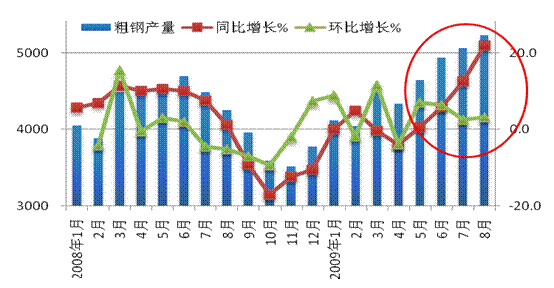 中國鋼鐵產(chǎn)能占全球總量的近一半,因此中國鋼材市場價格變化對國際市場有必然的影響。據(jù)國家統(tǒng)計局統(tǒng)計數(shù)字,8月份中國國內(nèi)粗鋼產(chǎn)量再度刷新創(chuàng)歷史最高記錄,達(dá)到5233萬噸,同比增長了21.97%;生鐵和鋼材產(chǎn)量分別為4931萬噸和6198萬噸(含重復(fù)材),分別比上年同期增長22.52%和28.90%。粗鋼日產(chǎn)168.8萬噸,環(huán)比增加3.26%。國內(nèi)價格上次觸底的時間在4月中旬,4月份粗鋼產(chǎn)量當(dāng)月環(huán)比減少0.4%,5-6月份粗鋼產(chǎn)量再度環(huán)比上升了5%,進(jìn)入3季度粗鋼產(chǎn)量再度環(huán)比上升,盡管環(huán)比升幅有所收窄,但已是連續(xù)第四個月產(chǎn)量增長。由于去年下半年粗鋼產(chǎn)量繼續(xù)下降,使三季度粗鋼產(chǎn)量同比增速大幅走高,8月份粗鋼產(chǎn)量同比增長了22.0%。