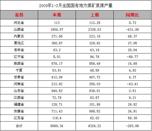 2009年1-3月全國(guó)國(guó)有地方煤礦原煤產(chǎn)量