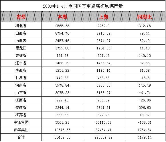 2009年1-4月全國國有重點煤礦原煤產量