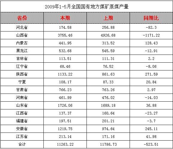 2009年1-5月全國國有地方煤礦原煤產(chǎn)量統(tǒng)計