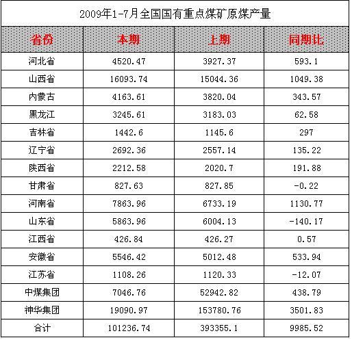 2009年1-7月全國國有重點(diǎn)煤礦原煤產(chǎn)量統(tǒng)計(jì)