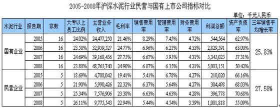 在2005年至2008年這4年間,我國滬深交易所共有21家水泥行業(yè)的上市公司,其中,國有控股上市公司16家,占76%;民營控股上市公司5家,占24%。以下圖表為“2005-2008年滬深水泥行業(yè)民營與國有上市公司經(jīng)營指標對比表”。