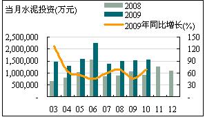 1~10月份,全國(guó)水泥累計(jì)投資額為1,339.24億元,同比增長(zhǎng)64.02%,較1~9月份同比增速有小幅提升。