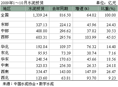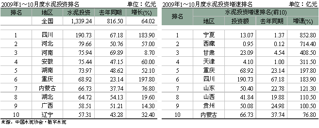 從各省市狀況來(lái)看,受災(zāi)后重建的影響,四川地區(qū)水泥投資依然居于全國(guó)首位,投資額為190.73億元,同比增長(zhǎng)183.90%,增速排名第6位;投資總額和增速位居前10的省市主要位于中西部地區(qū),證實(shí)了政府西部開發(fā)的傾向和經(jīng)濟(jì)發(fā)展重心的偏移對(duì)水泥行業(yè)發(fā)展所產(chǎn)生的影響。