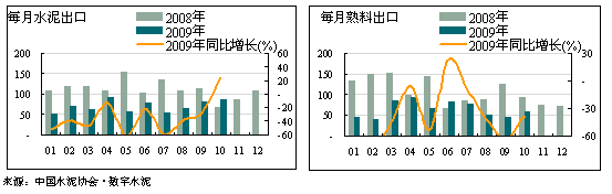 ——10月份水泥出口在9月份同比增長(zhǎng)的基礎(chǔ)上繼續(xù)大幅提升,首次實(shí)現(xiàn)了今年以來(lái)的同比正增長(zhǎng);熟料出口盡管仍未擺脫負(fù)增長(zhǎng),但較上個(gè)月的同比下降幅度已有很大程度的恢復(fù)。