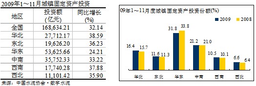 2009年1~11月,全國累計完成城鎮(zhèn)固定資產(chǎn)投資168,634.21億元,同比增長32.14%,比去年同期依然提高了5.3個百分點。