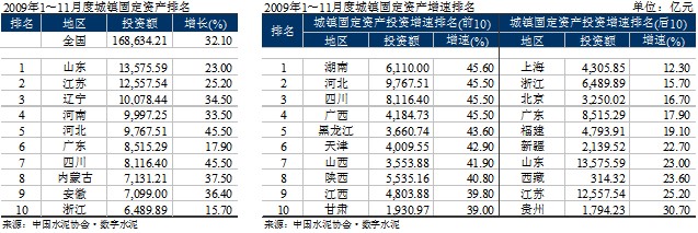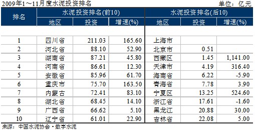 投資前10的。▍^(qū)、市)主要來自中南、西南地區(qū),政府西部開發(fā)的傾向與經(jīng)濟發(fā)展的偏移,也是西部水泥高投資的原因。其中四川地區(qū)受災后重建拉動,水泥投資額與水泥投資增速均高居全國第一,投資額為211.03億元,同比增長165.6%。
