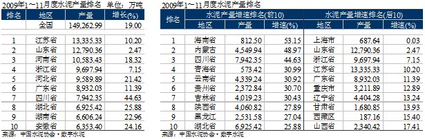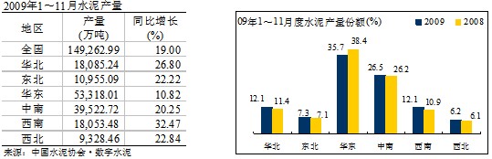 1~11月份,水泥市場逐漸見旺,產(chǎn)量以較高的速度增長,全國水泥產(chǎn)量14.93億噸,同比增長19%,增幅比去年同期提高了13.3個百分點。預計09年全年產(chǎn)量約16.4億噸,比08年約增加2.4億噸,同比增長約為17%。