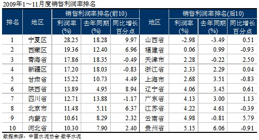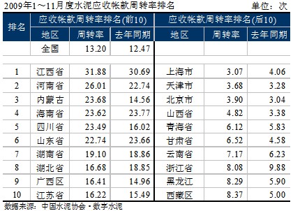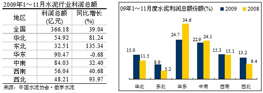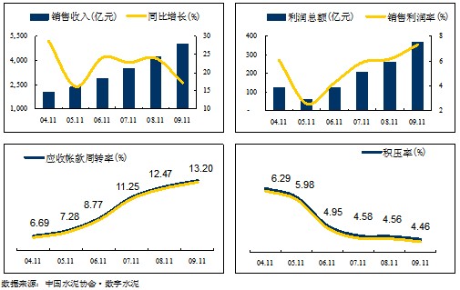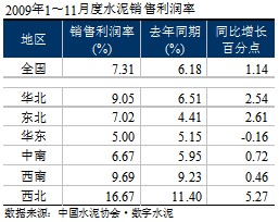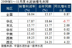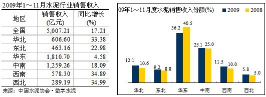 2009年1~11月,水泥市場在高需求的環(huán)境下,使得去年釋放的2億噸水泥產(chǎn)量基本消化,帶動了各項經(jīng)濟指標的提高:除銷售收入的增速低于去年外,利潤、銷售利潤率、應收賬款周轉率、積壓率等各項指標都不同程度的優(yōu)于去年。但在各個區(qū)域之間表現(xiàn)不一,分化明顯。