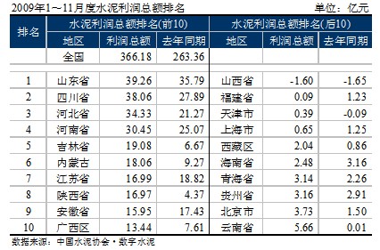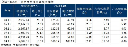 在摸索中奮進,種種迷霧和不確定性逐漸明朗。1~11月份數(shù)據(jù)顯示,盡管2009年產(chǎn)能釋放壓力前所未有,但在國家拉動經(jīng)濟政策下,水泥需求超預期,拉動水泥利潤總額、銷售利潤都高于去年水平。