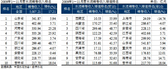 而受西部投資增大和四川災后重建的拉動,增速較高的地區(qū)幾乎都集中在西南、西北地區(qū)。其中增加明顯的省份分別是內(nèi)蒙古、四川、陜西:內(nèi)蒙古實現(xiàn)銷售收入170.27億元,同比增長55.4%;四川省實現(xiàn)銷售收入299.5億元,同比增長48.77%;陜西省實現(xiàn)銷售收入122.2億元,同比增長42.6%。