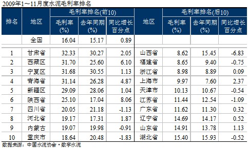 從發(fā)布數(shù)據(jù)看,西北、西南地區(qū)毛利率表現(xiàn)依然要好于其他地區(qū)。前10中,西北5省區(qū)全部入圍,西南除云南、貴州外也皆在其中,內(nèi)蒙古也列入排名在前10之內(nèi)。陜西毛利率提高了8.06個百分點,達到了25.1%,大大好于去年。西部地區(qū)的良好表現(xiàn),使全國的毛利率穩(wěn)固上升,拉升了全國的水泥市場。