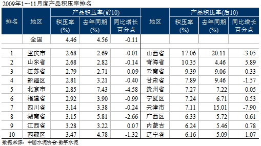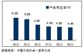 在水泥產(chǎn)量大幅增長的背景下,1~11月的全國水泥產(chǎn)品積壓率仍延續(xù)了近幾年連續(xù)下降的趨勢,為6.07%。產(chǎn)品積壓率下降的原因,主要原因是,市場需求好于預期,西北、西南局部地區(qū)還出現(xiàn)供不應求;而華東地區(qū)為四季度旺季提價做準備,持續(xù)減少產(chǎn)品庫存。