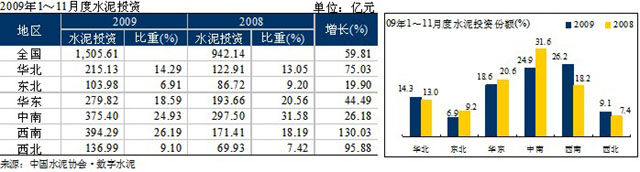 在擴內(nèi)需政策的拉動下,需求快速增長,利潤水平增長,拉動水泥投資持續(xù)火熱: 1~11月全國水泥投資1,505.61億元,同比增長59.8%,與去年同期持平,但仍處于高位增長區(qū)間。預計2009年全年水泥投資約1,650~1,700億元,投資額比2008年約增加600~650億元。