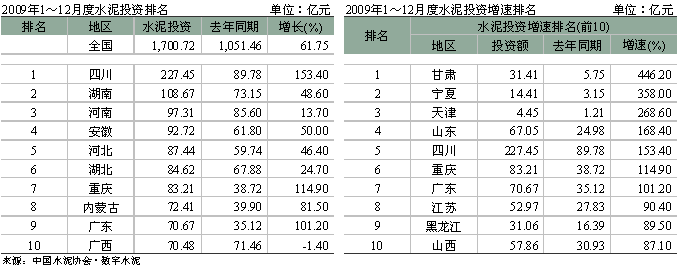從各省市狀況來(lái)看,受災(zāi)后重建的影響,四川地區(qū)水泥投資依然居于全國(guó)首位,投資額為227.45億元,同比增長(zhǎng)153.4%,增速排名第5位;湖南水泥投資超過(guò)100億,增長(zhǎng)48.60%;四川和湖南是全國(guó)僅有的兩個(gè)水泥投資過(guò)百億的省。