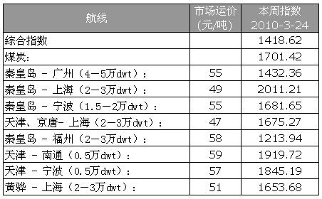 3月24日我國(guó)沿海主要煤炭運(yùn)輸線路運(yùn)價(jià)情況